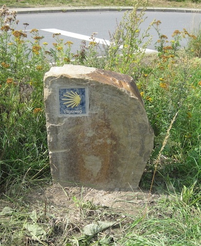Einer der drei Steine an den Abbiegungen des Jakobsweges. Dieser Stein aus Ruhrsandstein wurde vom Heimatverein aus einem Steinbruch in Herdecke geholt.